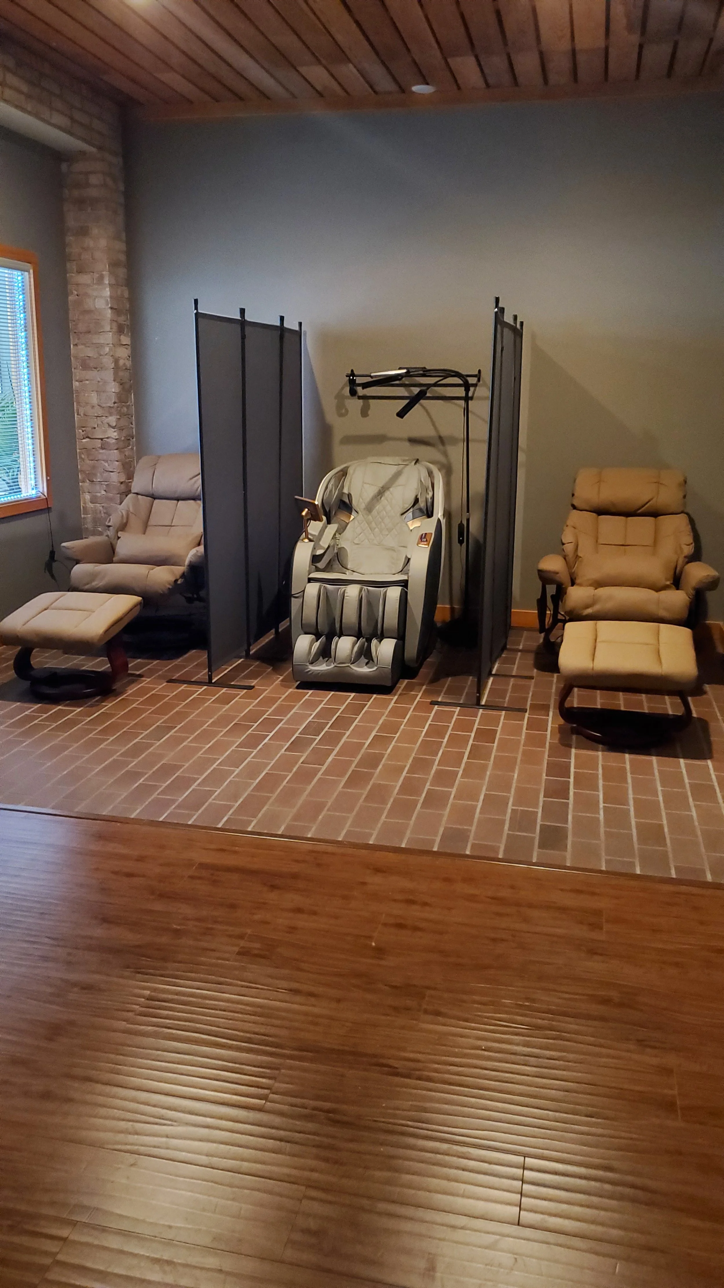 Our Comfy Lounge is designed for a total reset, offering a calm environment where you can relax, recharge, and prioritize your well-being anytime during scheduled business hours—whether you’re recovering from physical stress or simply taking time for yourself.